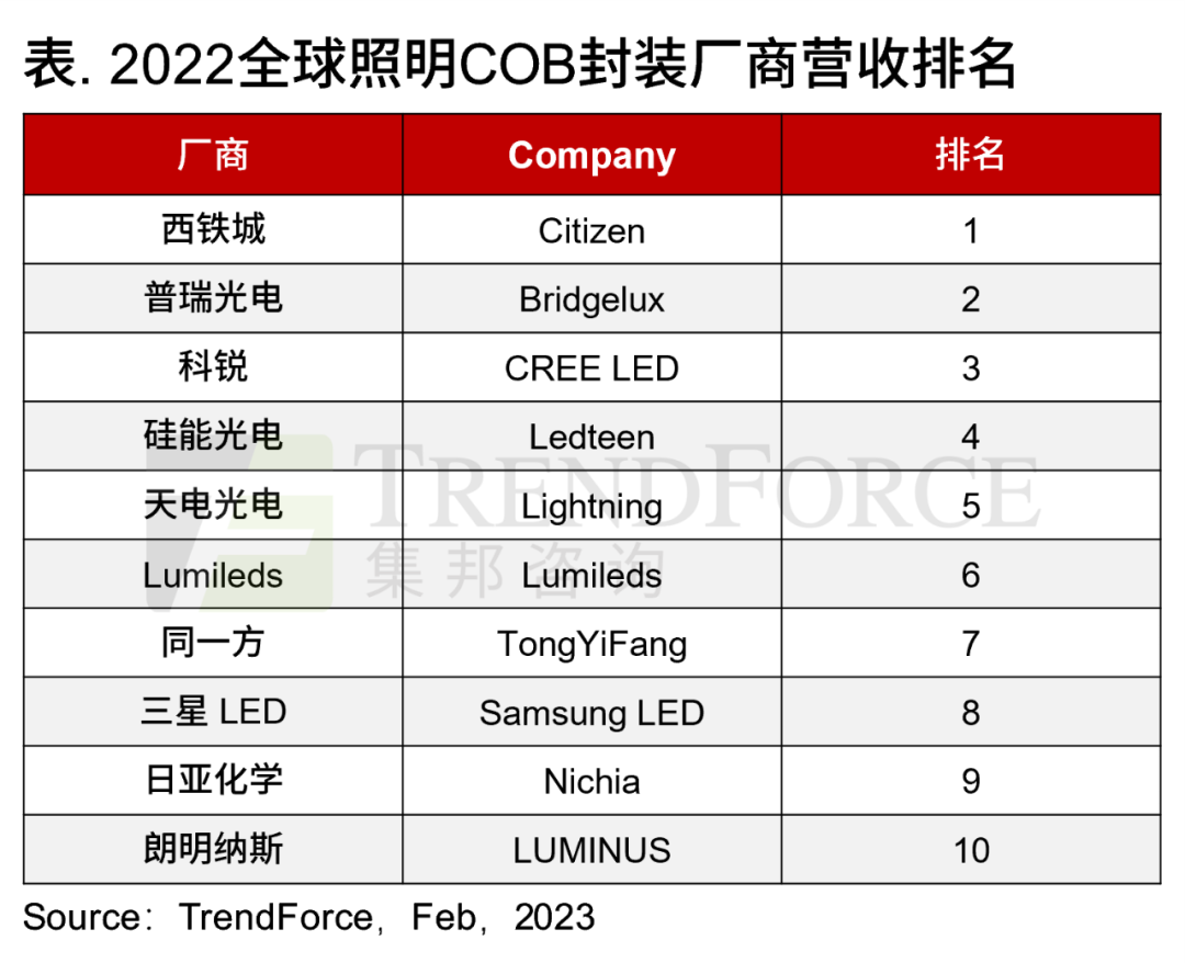 CREE是不斷耕耘照明市場,主推主推大功率和COB產(chǎn)品,產(chǎn)品廣泛應(yīng)用于路燈、隧道燈及其他戶外大功率照明產(chǎn)品。2022年受商業(yè)照明市場需求下滑的影響,CREE COB封裝業(yè)務(wù)亦受到?jīng)_擊,不過依舊排名第三。