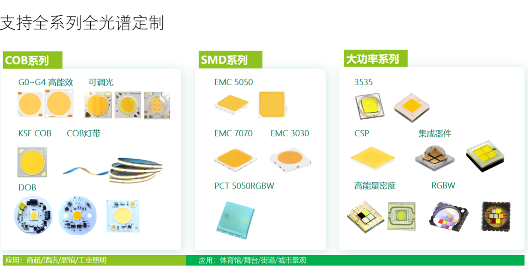 主要產(chǎn)品有:COB 全光譜產(chǎn)品系列、陶瓷大功率產(chǎn)品系列、SMD 產(chǎn)品系列,配備萬級(jí)無塵生產(chǎn)車間,擁有先進(jìn) LED芯片封裝產(chǎn)線和自動(dòng)化、數(shù)字化管控體系,客戶主要為國(guó)際一線照明設(shè)施制造商或品牌營(yíng)運(yùn)商。
