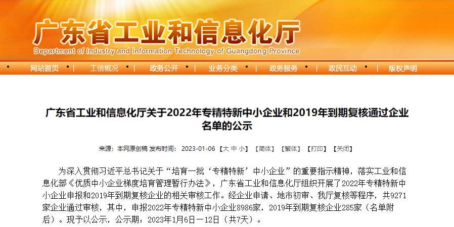 近期,廣東省工業(yè)和信息化廳公示了2022年專精特新中小企業(yè)的認定名單,金年会jinnian光電位于其中。